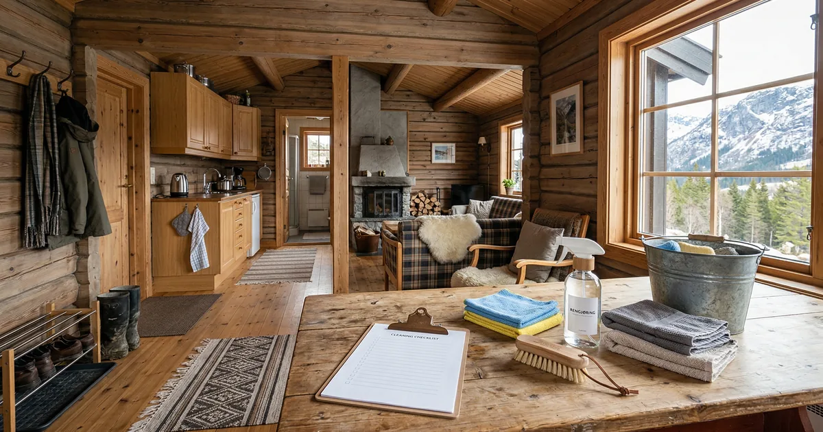 En ren hytte starter med riktig plan - ikke mer arbeid. Her er den komplette sjekklisten for daglig klargjøring, ukentlig vask, sesongvask etter vinteren og grundig utvask, rom for rom.